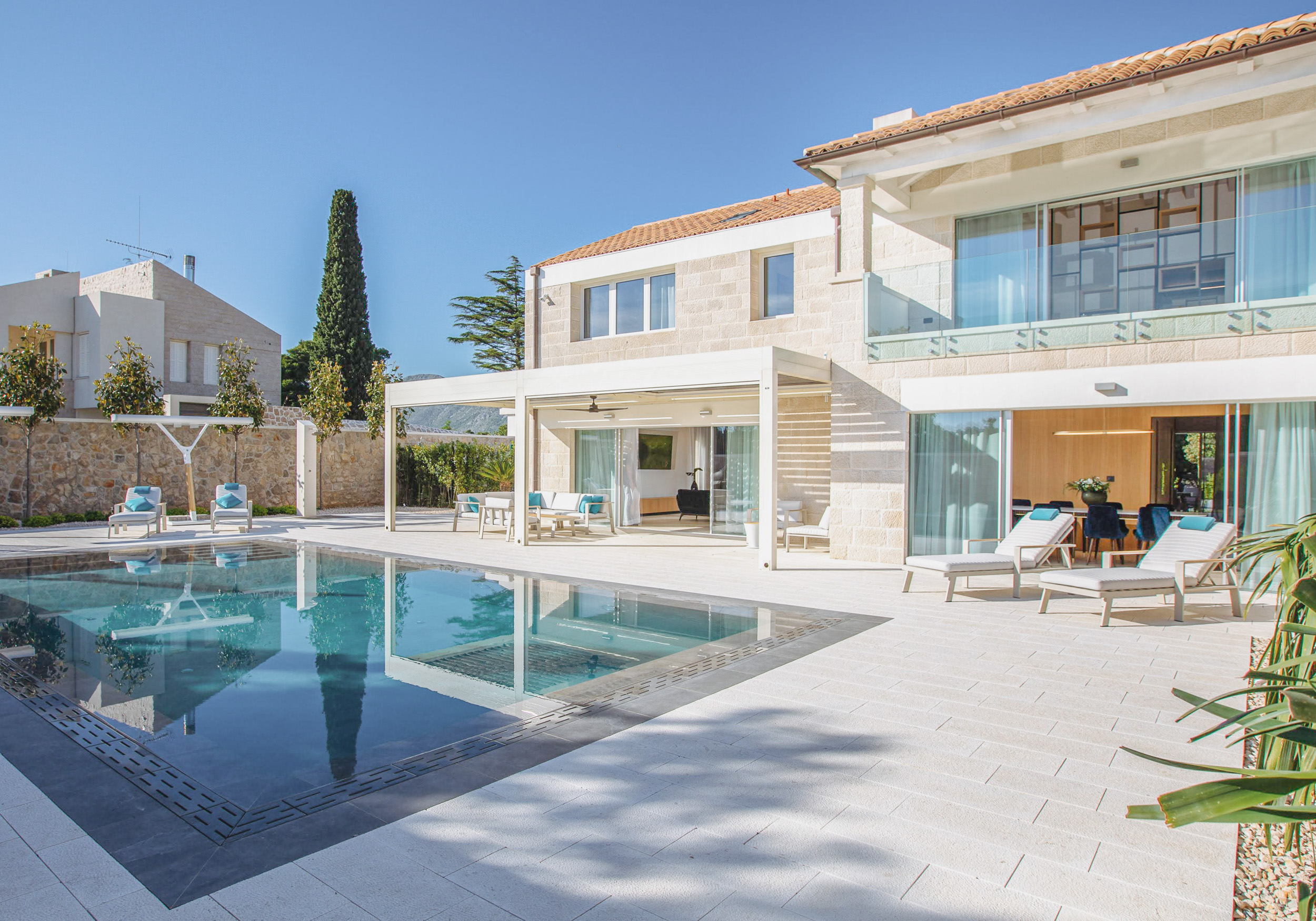 Villa Lidija – A stylish coastal base with sun-soaked terraces and sea-view lounging; close to the Old Town yet peacefully set for lazy afternoons. Highlights include a home gym, a sauna, and a heated infinity pool with panoramic views of the Adriatic Sea, nearby islands, and glimpses of Dubrovnik’s ancient city walls.