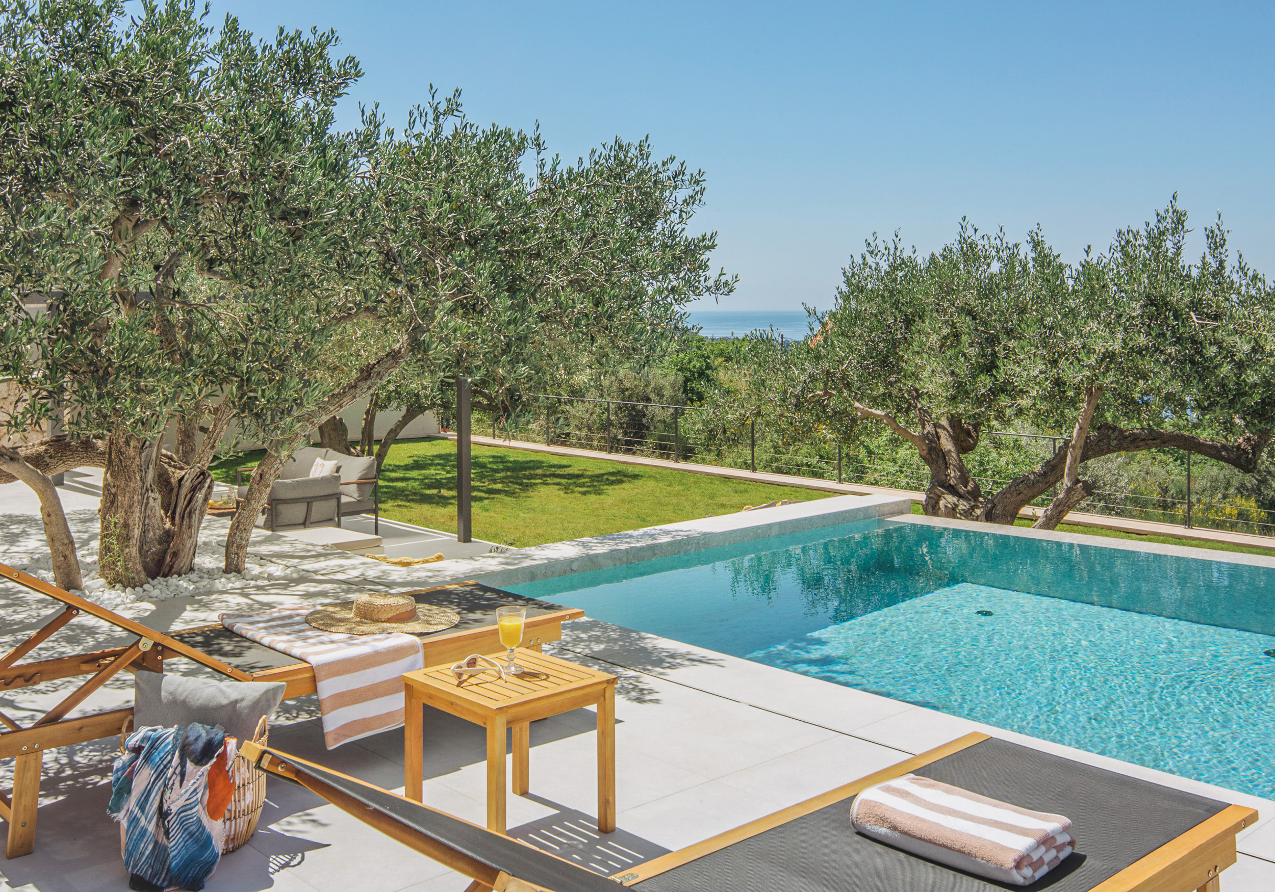 Maris Vista – Light-filled, contemporary spaces with panoramic sea views and seamless indoor-outdoor living. This luxury villa offers beautiful outdoor areas, with a large heated pool featuring a fountain that overlooks the surrounding greenery and sparkling sea.